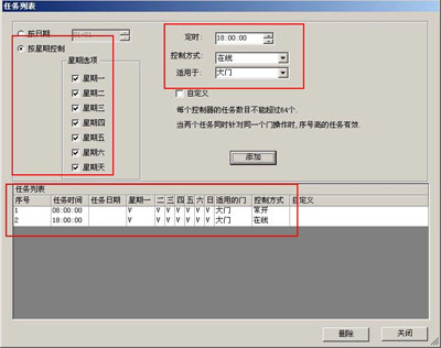 進(jìn)行定時任務(wù)設(shè)置,添加兩個定時任務(wù),設(shè)置完畢后 到 [總控制臺] 上傳設(shè)置,注意上傳完畢后,由于還沒有到啟動定時任務(wù)的時間,所以門的系統(tǒng)還是保持在線狀態(tài).