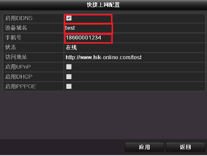 勾選啟用DDNS,設置設備域名(自定義,只支持小寫字母、數字以及“—”且必須以小寫字母開頭,必填),手機號碼(后續增值服務使用,必填)。當設備狀態顯示在線時可以使用自動生成的訪問地址來訪問設備。